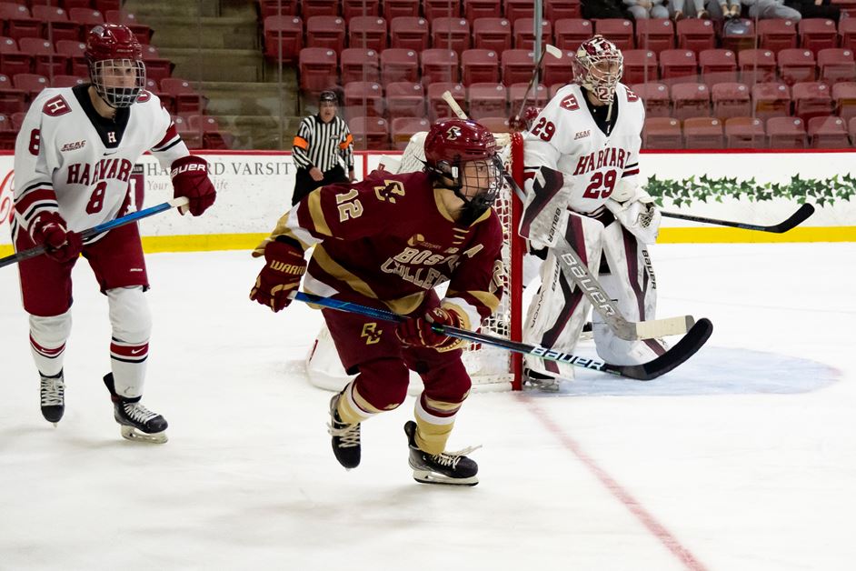After clearing the puck from the BU end, the duo of Armstrong and Peterson found themselves in a 2-on-1 with Huskies star defenseman Jordan Harris. Armstrong held the puck out as Harris went onto his stomach to try and prevent the pass. Armstrong held the puck long enough for Harris' momentum to give out, leaving a tiny lane for the BU forward to find Peterson.