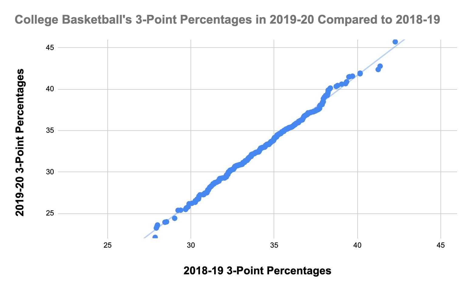 You'll see that around the 40-percent mark on the y-axis, which represents the current season, there start to be more points located above the trend line, showing a relative increase in 3-point percentage among the national leaders compared to last season. For example, this season's best ;3-point shooting team, Saint Mary's, has a better 3-point percentage than the best 3-point shooting team last season, Lehigh, so the top point is above the trend line.