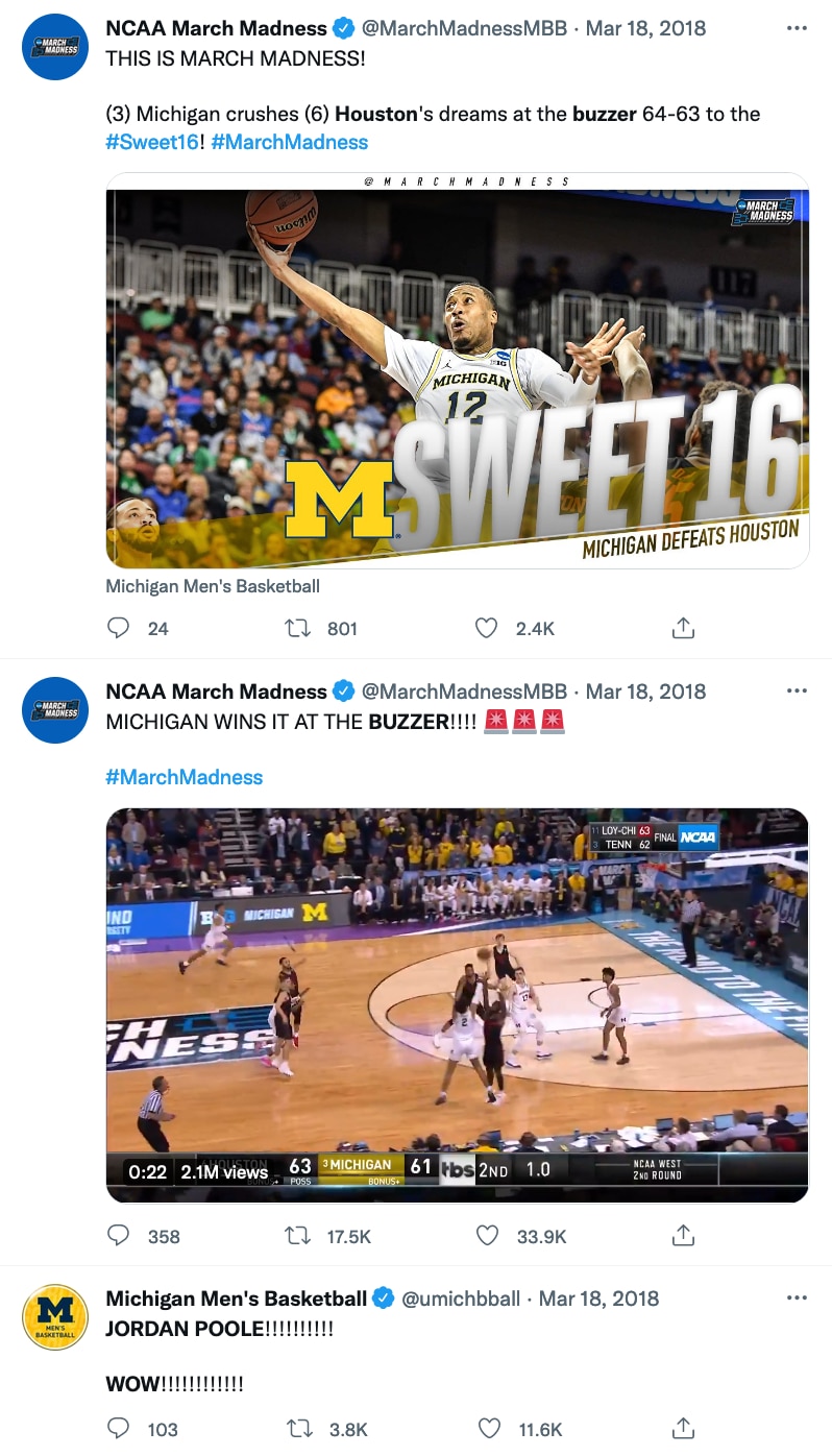That was CBS' Brad Nessler's call of Michigan guard Jordan Poole's game-winning buzzer-beater over No. 6 seed Houston in the second round of the 2018 NCAA tournament — tied for the fifth-longest game-winning buzzer beater in the history of the NCAA men's basketball tournament — Michigan's 11th win in a row, en route to the Wolverines' eventual run to the national championship game for the second time in six seasons.