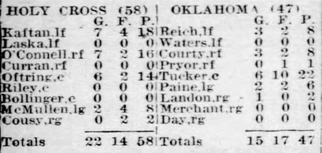 Initially, it was Billy Mann and Gene Melchiorre at guard, with Charles Grover and Paul Unruh at forward, and Elmer Behnke at center. But a week later, the guards were Grover and Behnke, the forwards were Melchiorre and Mann (the latter's last name was listed in the box score as "Monn"), and the center was Unruh.