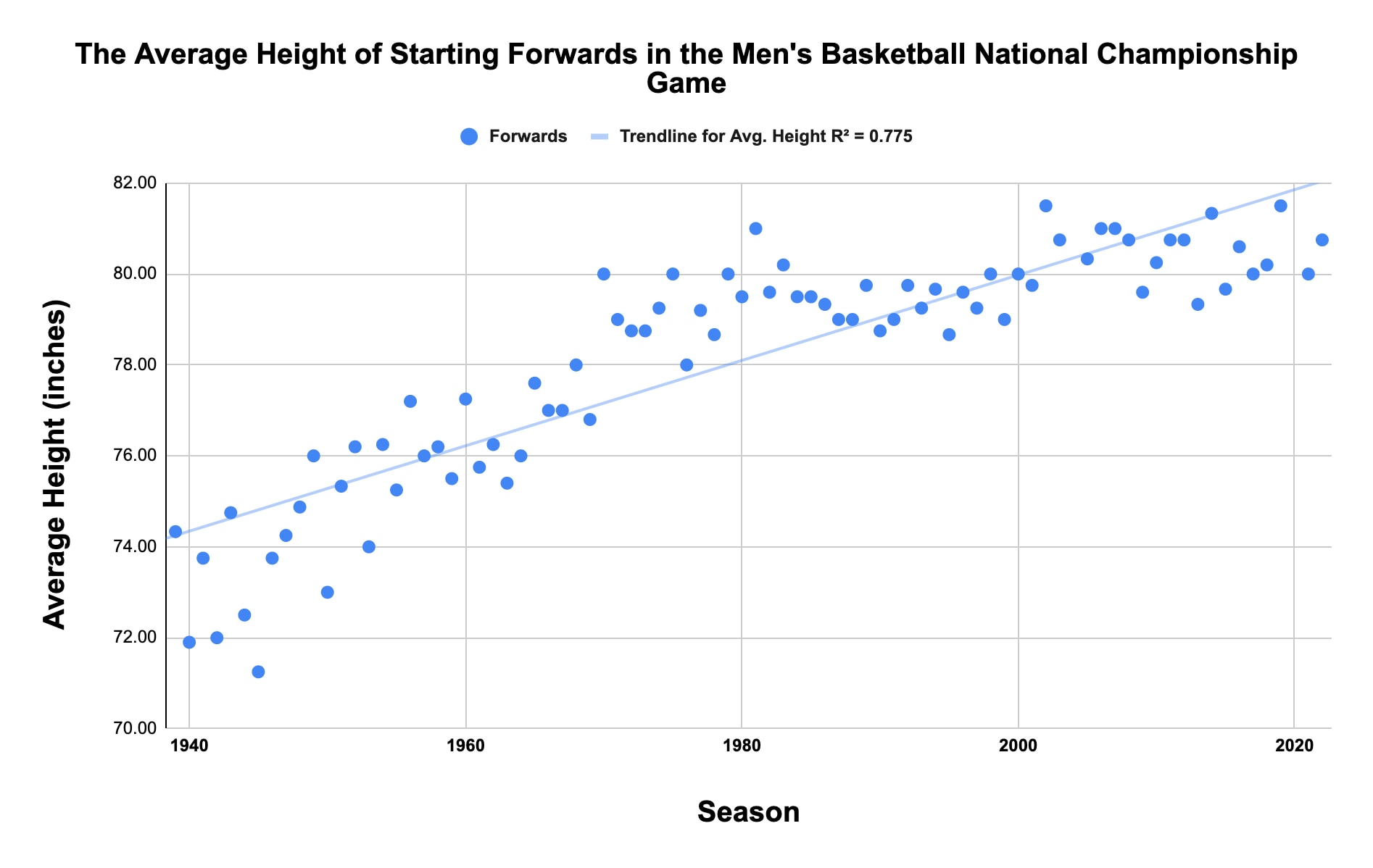 The scatter plot below shows the average height of the starters in every men's basketball national championship game, along with a polynomial trend line that shows the recent, slight downturn in average height. Note that data isn't available for every starter for the 1939, '43 and '44 title games.