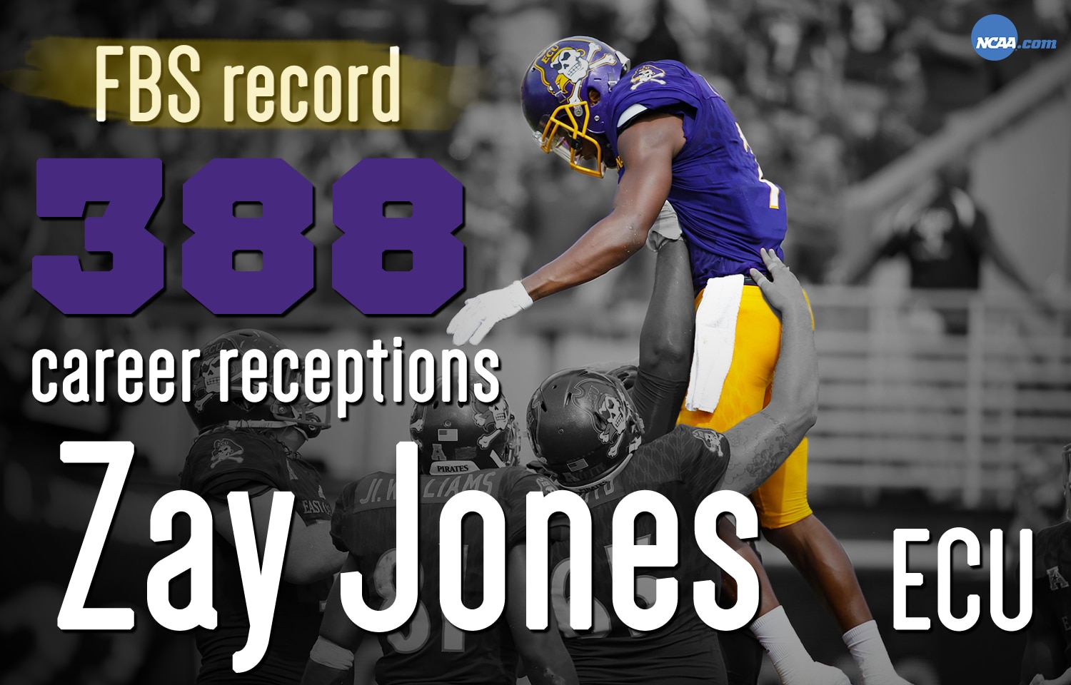 East Carolina wide receiver Zay Jones broke the FBS record for career catches, as he grabbed his 388th reception in the second quarter against Navy on Saturday.