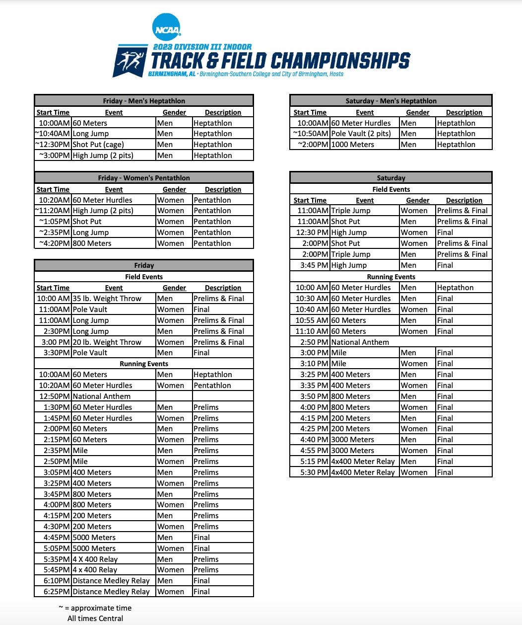 For each men’s individual event contested, including the heptathlon, the top 20 declared student-athletes were accepted into the competition.  For each women’s individual event contested, including the pentathlon, the top 20 declared student-athletes were accepted into the competition.  For each relay event contested, the top 12 declared relay teams, one per institution, were accepted into the competition.  The championships will be held March 10-11 at the Birmingham CrossPlex in Birmingham, Alabama, with Birmingham-Southern College and the City of Birmingham serving as hosts.