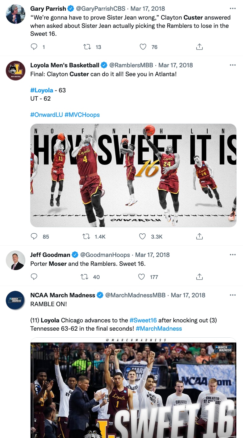 One at a time, they held and kissed the trophy while the other players picked up handfuls of confetti that had fallen and threw it in the air to let it slowly flutter to the ground once again. Because while they’ve gone from the Missouri Valley Conference champs to arguably the biggest story in sports in a matter of two weeks, the Ramblers, just like anyone else, can’t pass up the chance to share their latest achievement on social media.