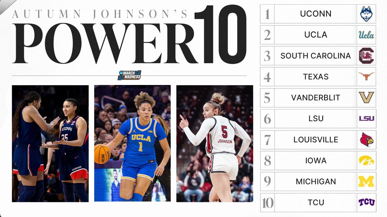 With March Madness approaching, Autumn Johnson revealed her first NCAA women's basketball tournament bracket predictions of the season. UConn, UCLA, South Carolina and Texas grabbed the No. 1 seeds.