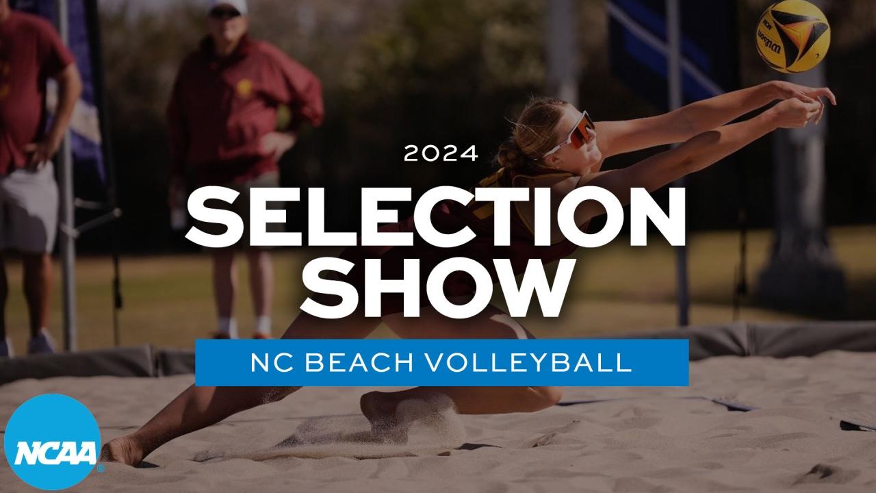 INDIANAPOLIS β The NCAA Beach Volleyball Committee announced today the 17-team field for the 2024 National Collegiate Beach Volleyball Championship. The field was selected from the 97 NCAA institutions sponsoring the sport of beach volleyball. Nine teams were selected as automatic qualifiers, along with eight teams selected at-large from across the country. All 17 teams were then seeded.