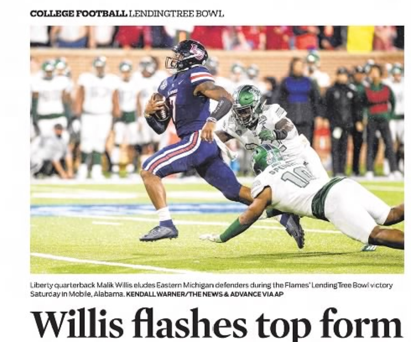 The Journal Gazette, after Liberty beat Western Carolina 58-14 in November 2020: "Malik Willis threw for 306 yards and three TDs and ran for two more as the Flames won their 10th straight game and trail Notre Dame for the nation's longest active winning streak."